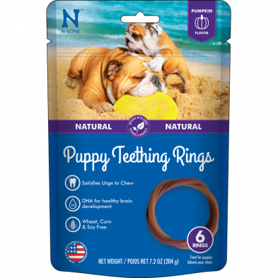 Growing new teeth is tough work and it makes for some sore gums! Sore gums and a strong urge to chew while cutting new teeth can turn your precious puppy into a whirlwind of destruction. N-Bone® Puppy Teething Rings are easy for floppy puppy paws to hold onto and provide a soothing and appropriate outlet for chewing. Formulated with DHA and calcium to support your puppy’s unique nutritional needs, our delicious pumpkin flavored rings are pliable and won’t damage immature teeth.